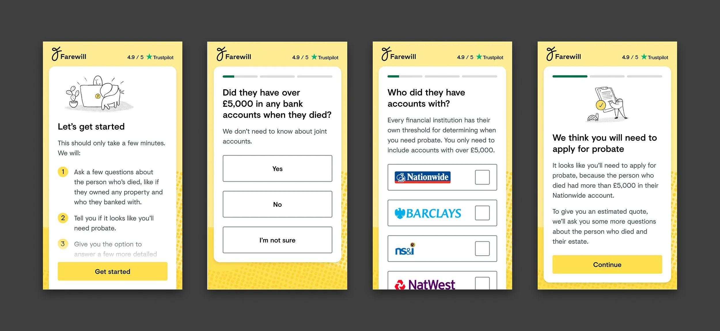 As funerals and probate are at-need services, Farewill’s main way of acquiring customers is through PPC landing pages targeting people searching online. As Design Lead, I worked with product teams to create landing pages tailored to different search terms and to AB test messaging and CTAs .